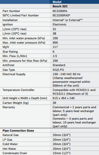 The Bosch 32C is a 6-star appliance suited to both domestic and commercial settings – anywhere there is a demand for large volumes of hot water. It can be configured for either internal or external installations and is available in Natural or LP Gas.