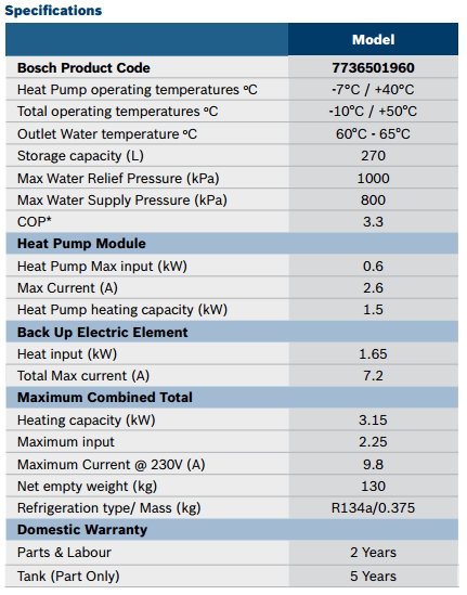 The heat pump operates from -7°C to 40°C, delivering energy efficient hot water even in colder climates