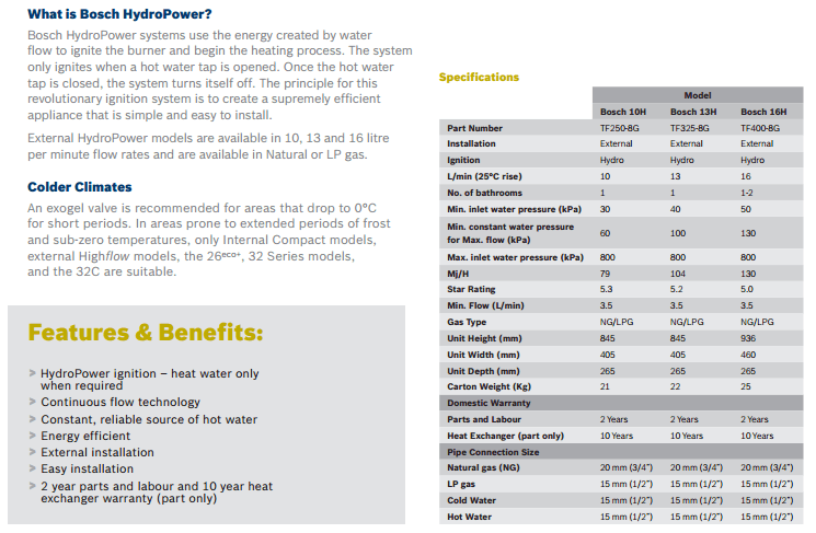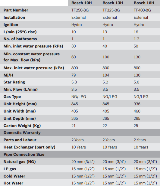 The Bosch 16H delivers a 16 L/min flow rate and is available in Natural or LP Gas. It is suitable for 1-2 bathroom homes and conveniently provides continuous hot water without a powerpoint or a standing pilot light.
