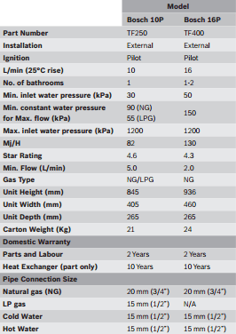 Bosch Pilot Ignition systems are available in 10 or 16 litre per minute