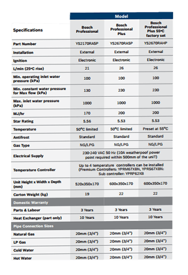 The Bosch Professional Plus delivers 26 L/min at a 25°C rise, has a 5.53 energy efficiency rating and is available in Natural or LP Gas. It is compact and easy to install. The Bosch Professional Plus 50°C is limited to a maximum temperature of 50°C and therefore requires no additional tempering valves. Whether building a new home, or replacing an existing hot water system as part of a renovation, a Bosch Professional provides uncompromised