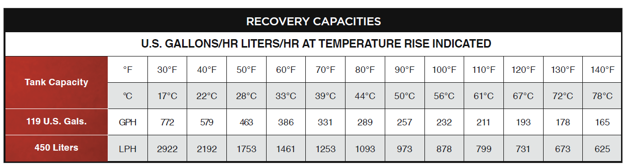 First Hour Rating: 315 gal / Recovery: 231 gal (@ 100°F ΔT)