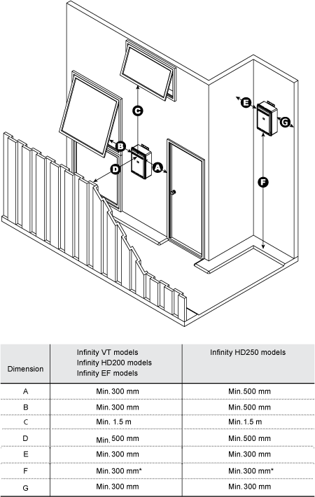 Clearance below eaves, balconies, and other projections, for all models is 300 mm.