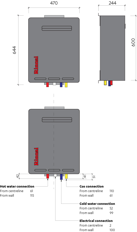 * Rinnai recommend 1.5 m to give enough clearance for the pipe work, and to safely expel flue gases.