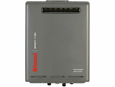 Rinnai temperature controlled continuous flow gas hot water system for external applications. Factory preset to 55 °C.